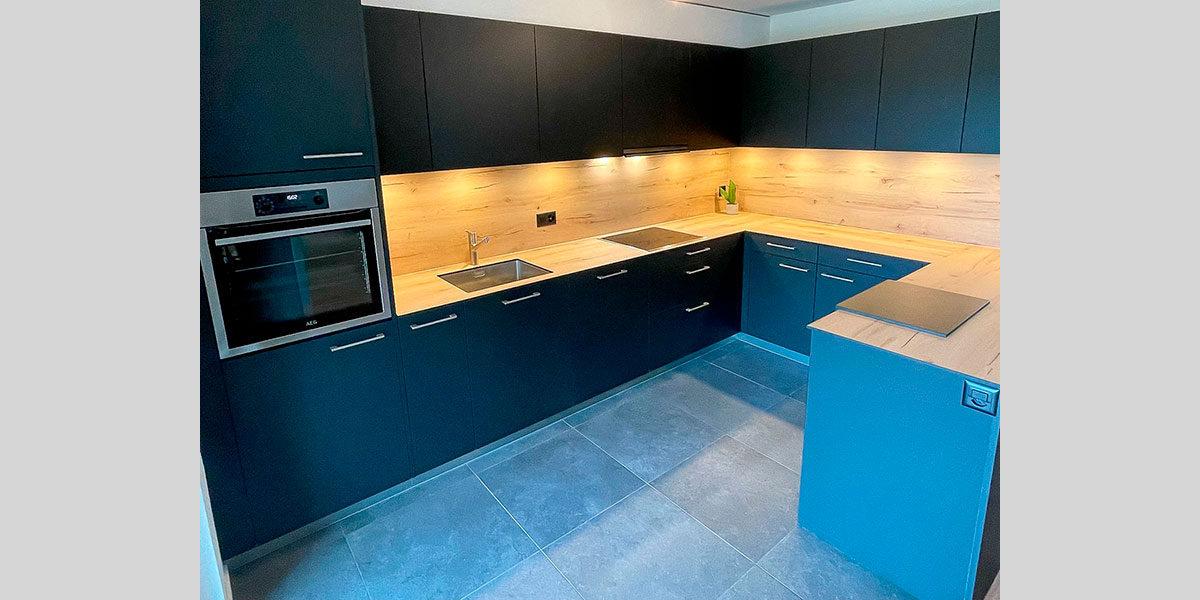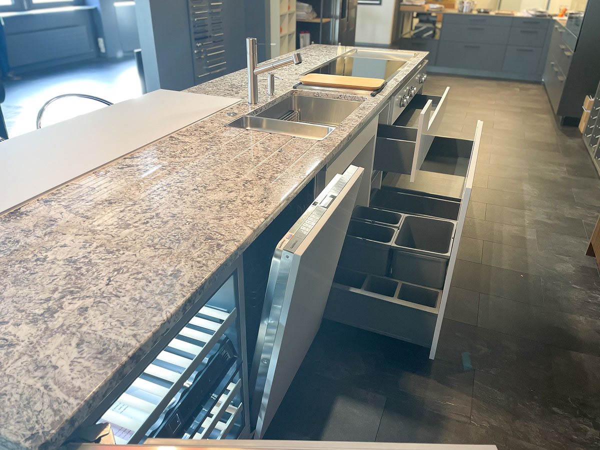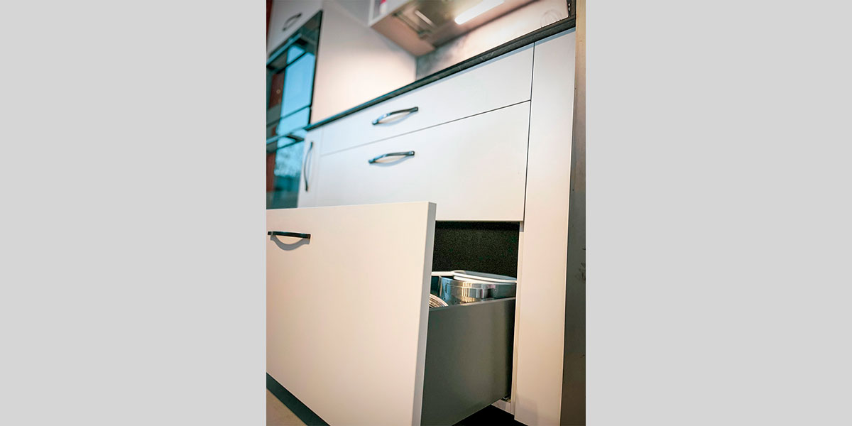 - Du rangement pratique, comme des tiroirs à l’anglaise, range bouteilles et corbeilles coulissantes, aménagements d’angle