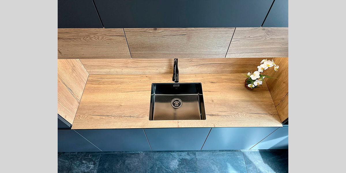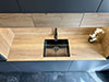- De la robinetterie avec un mitigeur cuisine, douchette extractible incluse, au grand évier qui permet d’accueillir les plaques de fours en entier